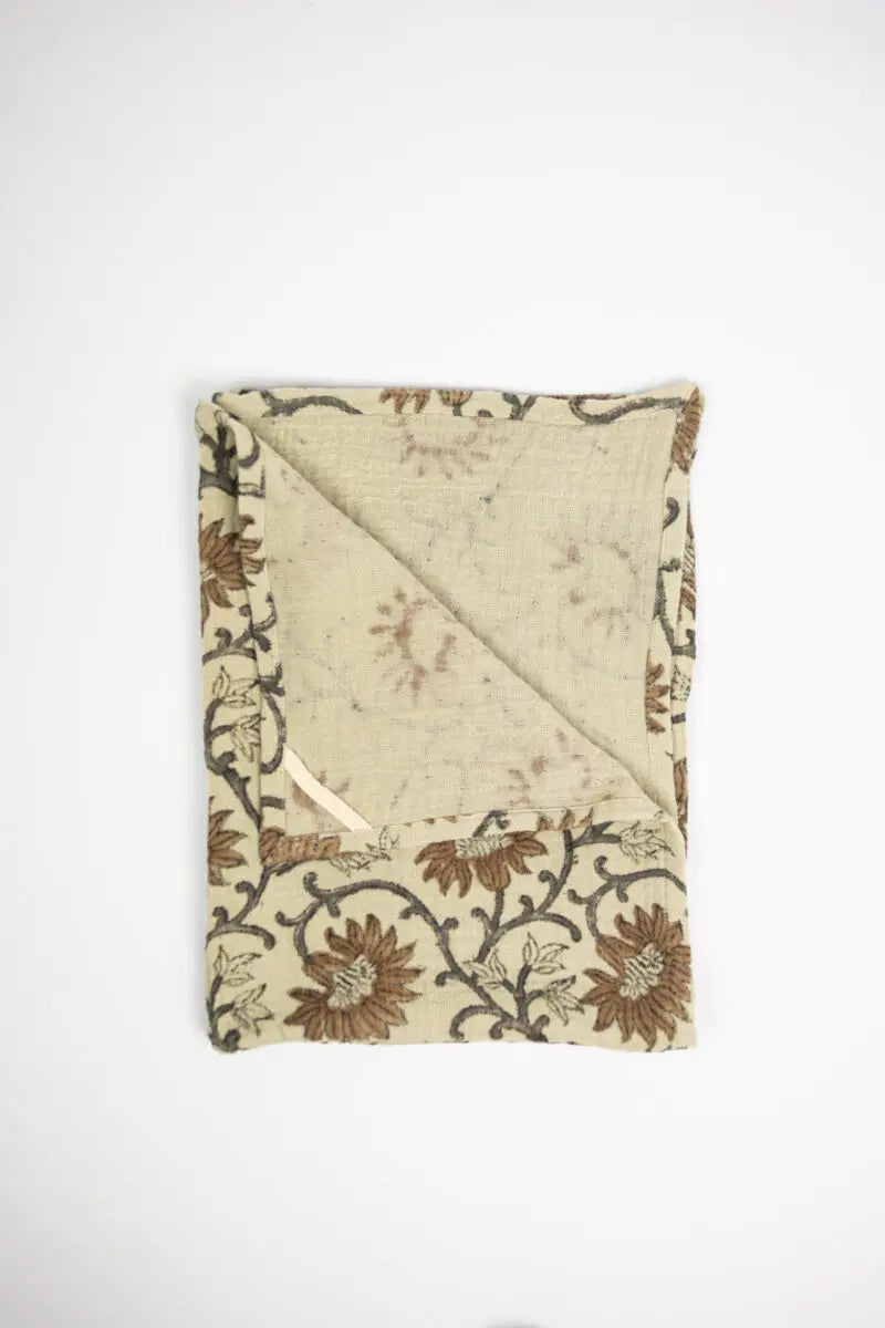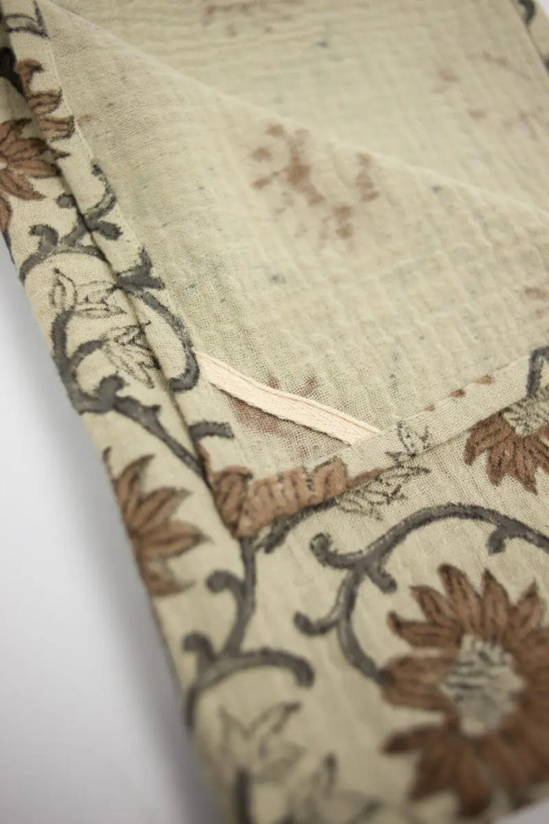 Super fin handduk med snyggt mönster. Tillverkad med handgjord blocktrycksteknik. Blocktrycksteknik är en traditionell metod där mönster skapas på textilier genom att trycka designen med ett handskuret träblock. I denna process appliceras varje design noggrant för hand, vilket gör att varje tryck blir unikt. Den handgjorda tekniken ger varje textil en personlig karaktär, där varje exemplar bär på sin egen historia och charm.