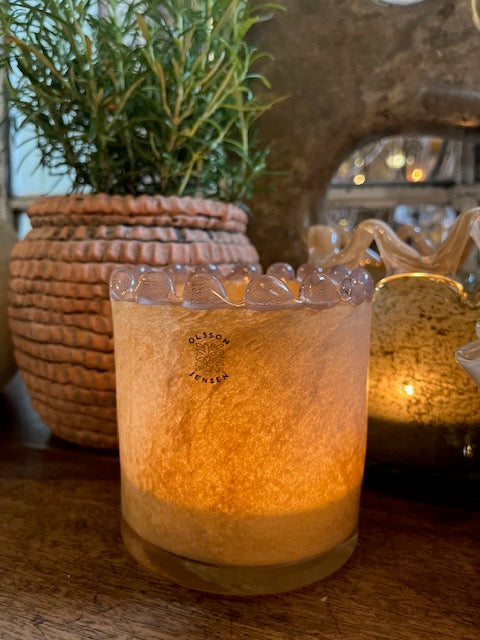 En lyxig glaslykta med dekorativa prickar längs kanten, som ger en lekfull och glad känsla.