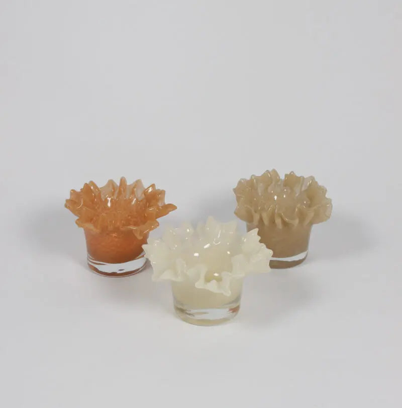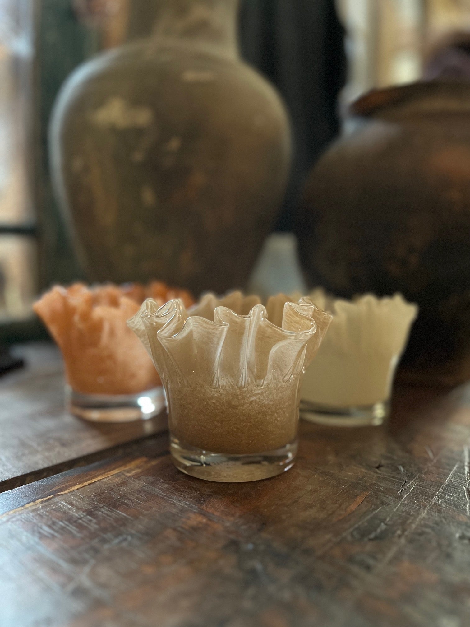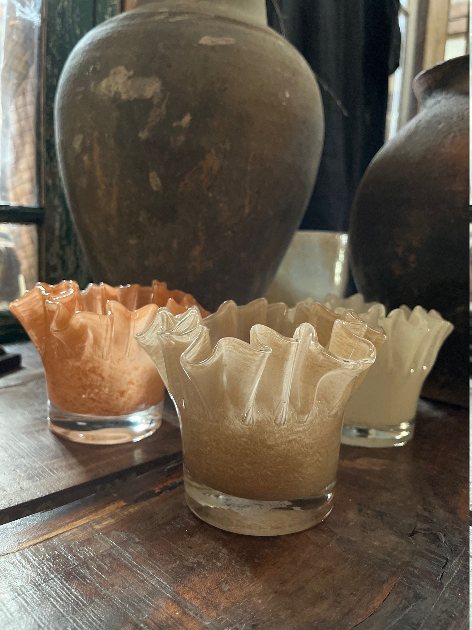 En vacker, glad och lekfull ljuslykta som samtidigt utstrålar elegans. Då lyktan är handgjord förekommer skiftningar i färg och form som gör varje produkt unik. Så fina var för sig eller tillsammans i grupp. Välj mellan tre färger vanilj, beige, persika.
