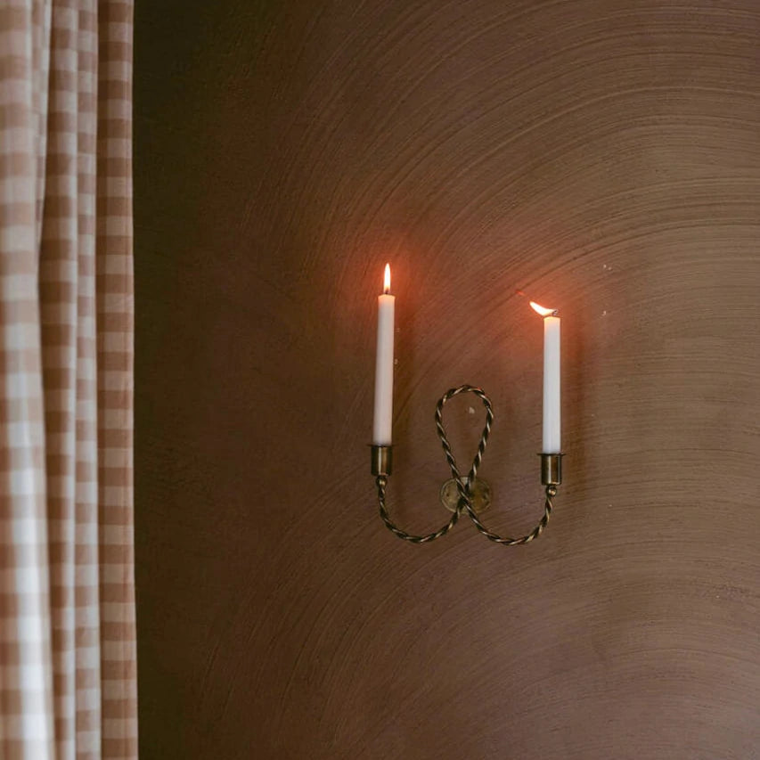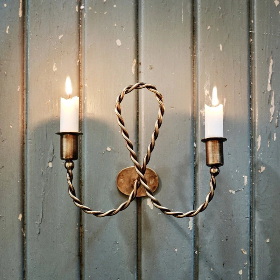 Elegant väggljusstake i antik mässing, med hållare för två kronljus. Blir en unik och förtrollande detalj som också ger en nostalgisk känsla i hemmet. Placera den bredvid en entré för att skapa en varm och välkomnande atmosfär eller använd den som en stämningsfull belysning i vardagsrummet eller sovrummet.