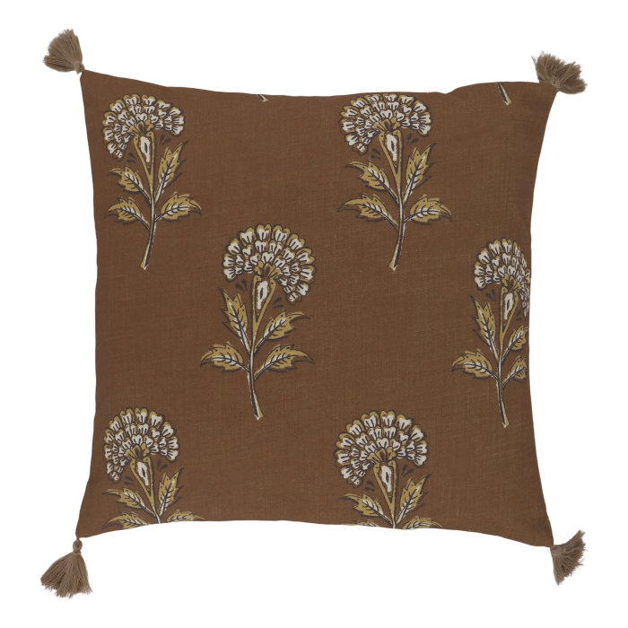 Superfint kuddfodral med terracottafärgad botten, tofsar i hörnen och blommönster.