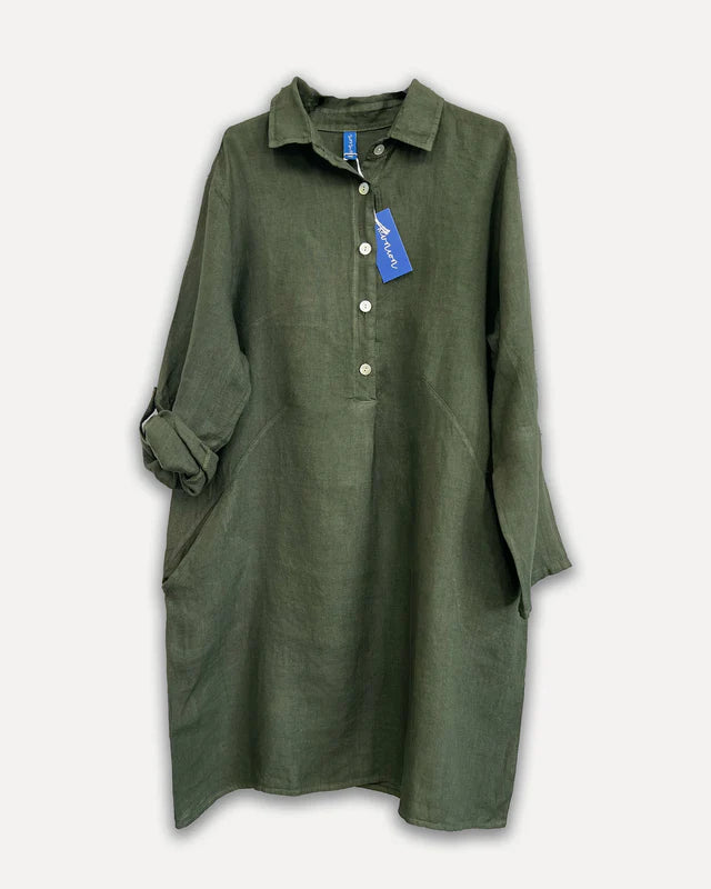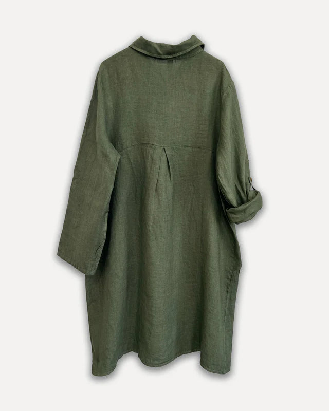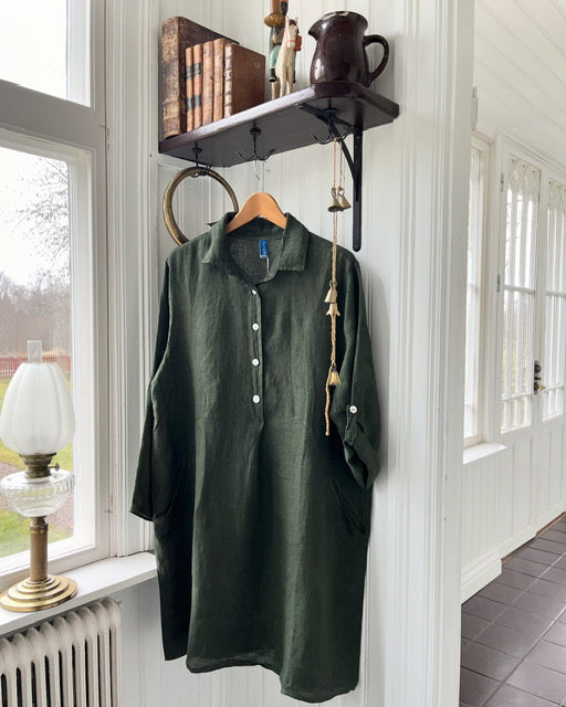 Vår älskade klassiker är tillbaka! Denna linne-skjortklänning är en tidlös favorit med praktiska fickor och ärmar med rullflik, vilket ger en avslappnad och stilren look. Perfekt för både vardag och lediga dagar, med den luftiga linnekvaliteten som ger en sval och bekväm känsla.