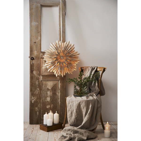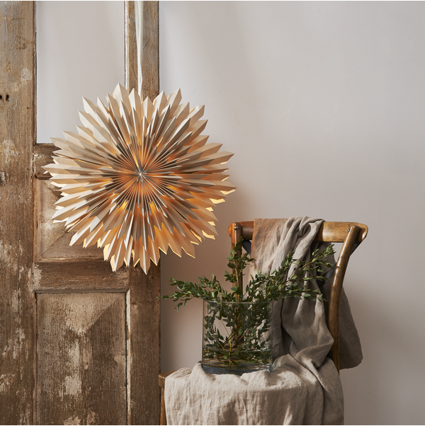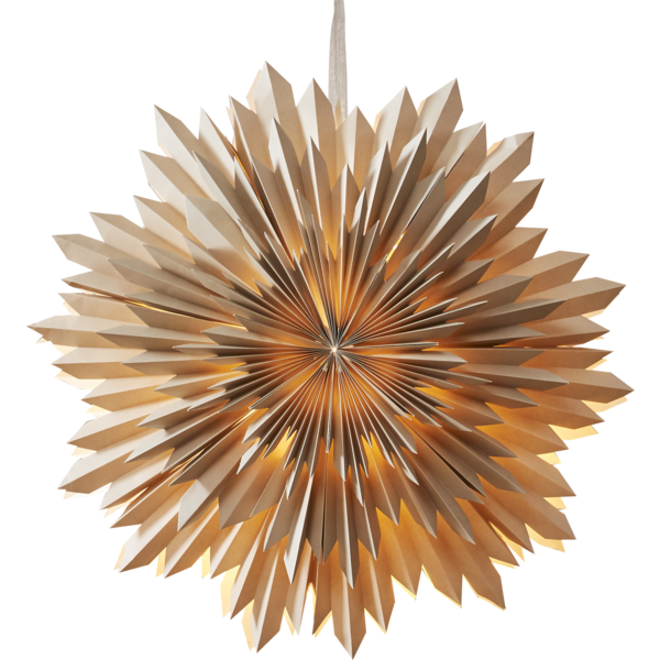 Fantastisk beige pappersstjärna som är tillverkad av tre lager veckat papper. Konturen är lite ojämn för en vintrigare känsla. Ett elegant band ingår för att lättare kunna hänga upp stjärnan. Stjärnan sprider stämning och ger hemmet den där speciella julkänslan. Kan hängas både i förnster och mot en vägg. Denna produkt har FSC®-märkning.